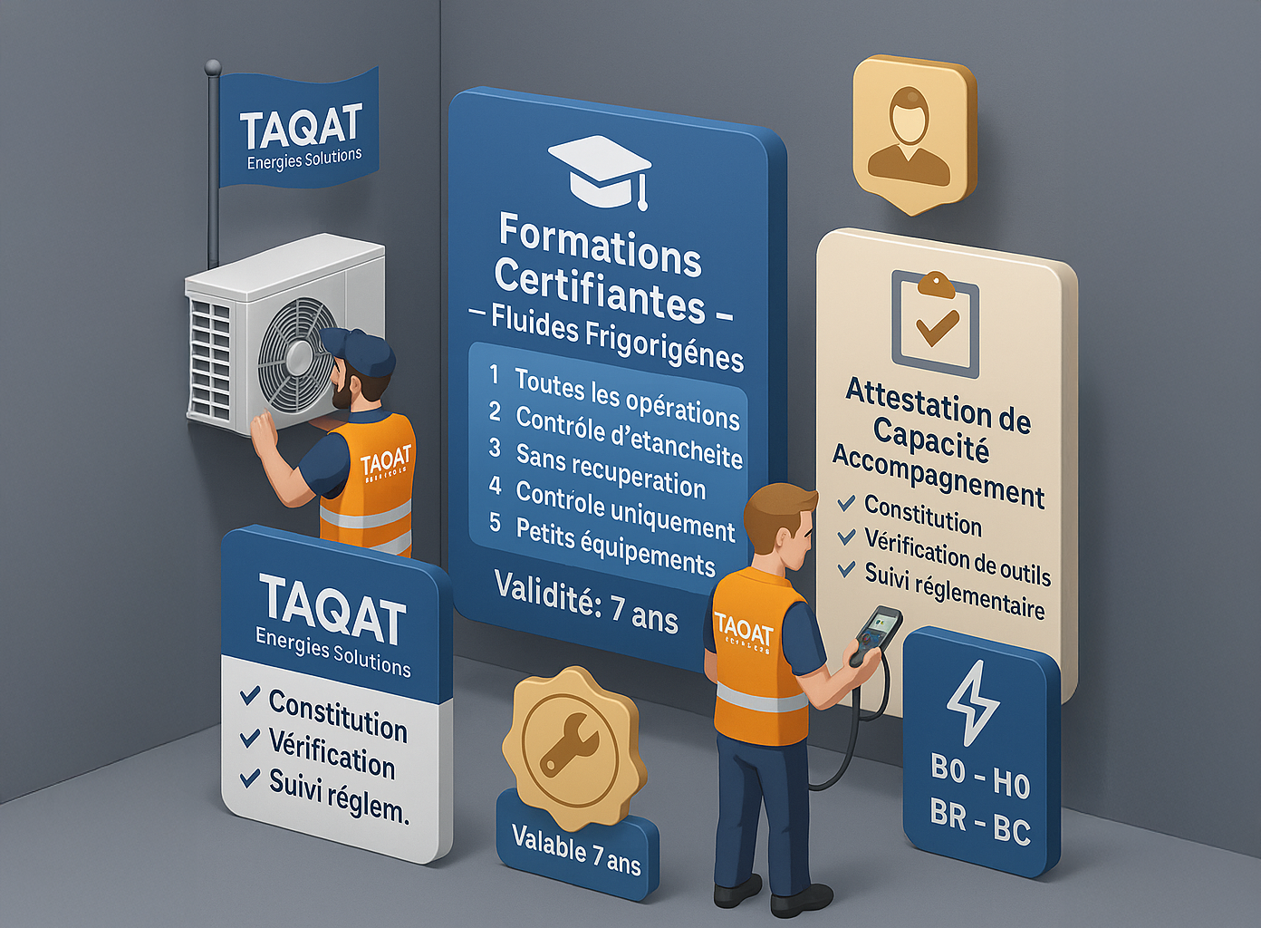 TAQAT Energies Solutions  vous accompagne dans vos démarches de formation spécialisée dans les domaines du froid, du génie climatique et de la sécurité électrique.
